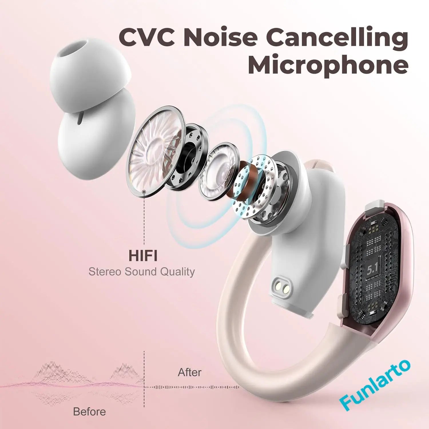 This wireless earbuds are engineered with CVC noise-canceling microphone for crystal clear and hands-free phone calls. 10mm full range dynamic driver unit speaker delivers not only the powerful deep bass but also crystal clearer sound. The Bluetooth headphones Equipped with Bluetooth 5.3 technology offers you fast stable Bluetooth connections between our over-ear headphones and your device range of 10m.