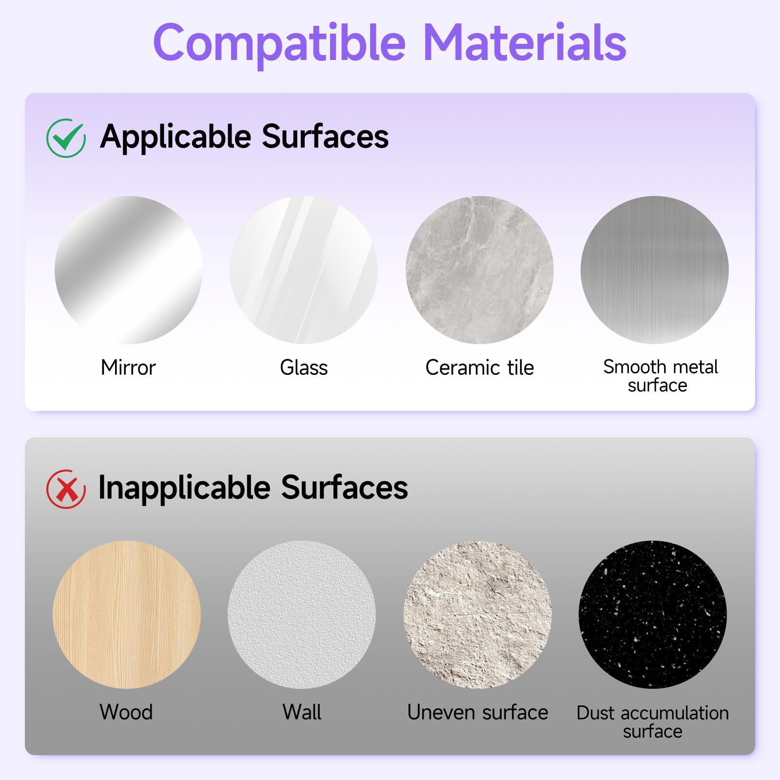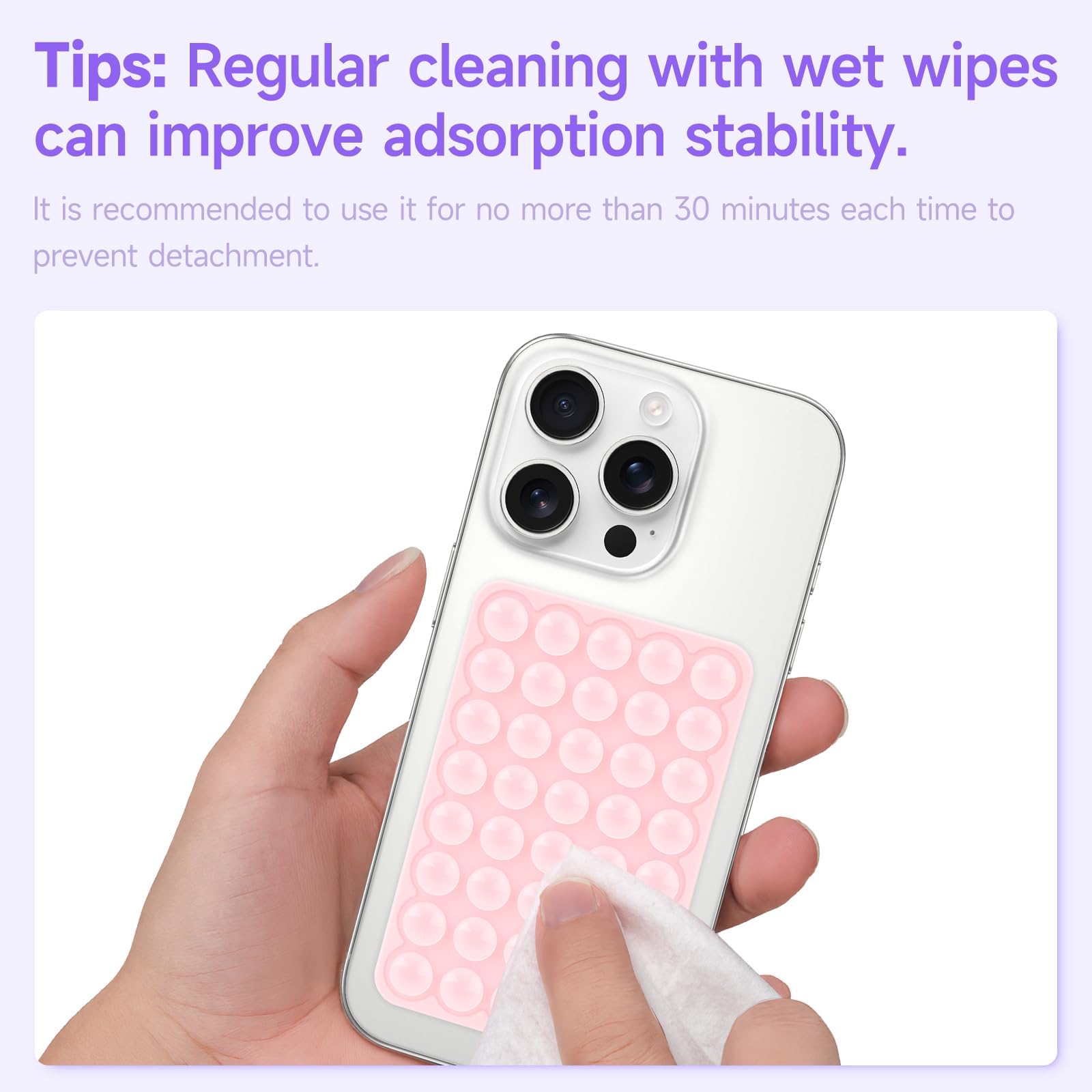 • Keep clean: Please regularly clean the dust on the phone suction cup surface, as it will affect the suction force of the suction cup.The adsorption time is related to the smoothness of the surface of the adsorbing object, and the effect of adsorption on mirrors and glasses is the best.The suction power of the suction cup phone mount will gradually weaken over time. It is recommended to use it for a maximum of half an hour at a time.
